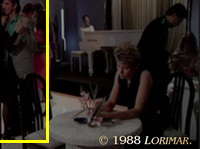 Uncredited extra ARLENA HOLLARMAN APISA, who has been playing Helen, the Del Oro Spa & Country Club chief receptionist, since # 135, appears in this episode again — not in her hotel uniform though, but in a pink dress as a dancer at The Max, probably after her shift at the front desk has ended.