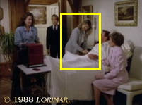 Uncredited extra ARLENA HOLLARMAN APISA, who usually plays Helen, the Del Oro Spa & Country Club chief receptionist, appears in this episode again — but not in her usual rôle. With a slightly different hairdo and in an appropriate outfit, she portrays the nurse taking care of Frank in his guest bedroom at the Falcon Crest Victorian Mansion.