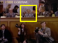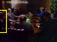 Another senator in the Senate Select Committee is named K. Latka according to his name sign, which is visible towards the end of the episode. The name is "borrowed" from KEN LATKA, the LORIMAR employee in charge of the film transfer in post-production. Senator Latka, who is seated next to Senator Dr. Walkling at the very end of the bench, is played by an uncredited very small gray-haired extra.