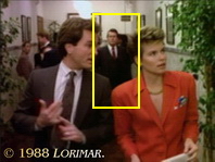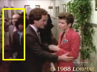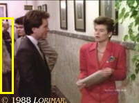 DAVID GUST, the tall, black-haired and mustached uncredited extra, who is best known for his rôle as an assistant district attorney (# 091, 092 and 154), but who also plays different characters in the series, appears in Washington, D.C. in this episode, obviously as a member of Richard's security team; first in the Senate Building in the hallway (screen capture 1), later in the hearing room (unpictured), then in front of Ryder's office (screen grab 2) and finally in the restaurant at the Watergate Hotel (picture 3). Not a wise decision to choose this extra because of his usual appearances as a Tuscany County A.D.A.