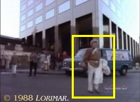 Uncredited extra TONI SCHABER appears as the curly haired platinum blonde again — this time as a passerby near The Thirteen's headquarters. Is it an unlikely coincidence that this Tuscany Valley resident is right there in New York City when Garth is there, or is this a case of negligent extras casting?