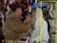 The blonde woman (uncredited extra) who is best remembered as the Coit Café cash counter lady (# 154) now appears as a reporter in front of the courthouse in Tuscany. She obviously changed jobs, which also explains why she went to Washington, D.C. in # 181 (compare there) and 182.