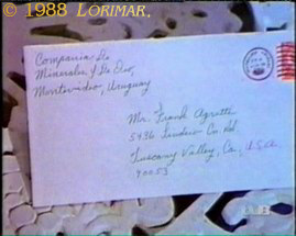 Libby's letter for Frank comes from the Compania De Minerales & De Oro, Montevideo / Uruguay. Another Agretti address can be read on the envelope — different from the ones seen in # 154 and 172 (see there): 5436 Lindero Canyon Road, Tuscany Valley, CA 90053. — There are probably three different addresses because the Agretti Residence consists of three wings (main, east and guest wings) with separate entranceways (compare # 013, 098, 103 and 193). The big mistake about this prop, however, is that 90058 is a zip code of downtown Los Angeles. Comparing other Tuscany zip codes (e.g. Del Oro in # 173), the zip rather has to start with "945-", but not "900-". Inside joke: 5436 Lindero Canyon Road is actually the street in Westlake Village, CA where a former filming location, the Pierce Brothers Valley Memorial Park, is situated. It was used in # 127 as the place where J.J. Roberts' grave was.