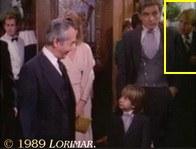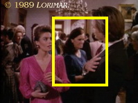 Uncredited extra BARBARA SMITH appears in this episode again as the platinum blonde Tuscany Valley socialite — at Emma and Daniel's "non-wedding" at Falcon Crest. She is standing right next to her real-life husband PETER EASTMAN in this scene. He is hardly visible behind the other gray-haired lady; for better visibility, refer to the note below.