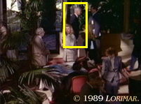 After his first appearance in this episode (see above), uncredited extra BUZZ BARBEE appears again in his usual rôle as a white-haired Tuscany Valley doctor — now as a patron at the San Francisco restaurant where Pilar and Malcolm are.