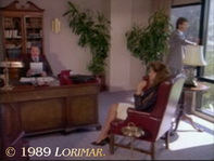The secretary's desk in the anteroom to Sharpe's office at Sharpe Capital Ventures is a LORIMAR owned prop that was previously used in other productions. For more details about its use on "Dallas" and "Knots Landing", check out the Beyond the Show – Props section.