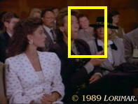 Uncredited extra CINDIE ABRAMS appears in this episode again as the middle-aged brunette with perm — this time among the spectators at the Tuscany County Courthouse.