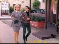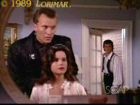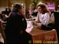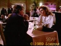 The shot of Angela raising her glass in the Falcon Crest Victorian Mansion dining room in this season's current main title (right screen capture) is from an unused version of the scene from # 169; in that episode, she was never seen toasting (compare the left screen grab for one of the shots actually used in that episode).