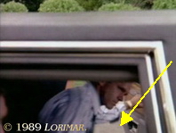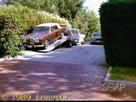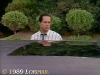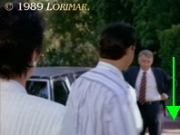 The ending of that scene — when Sharpe gets into the limo, tells Ed to get off and then speaks to Nick — was not lifted from # 207, but had to be reshot to slightly adapt it to the current episode. It was not filmed at Arden Villa again though, but on the backlot of CBS-MTM STUDIOS (nowadays RADFORD STUDIO CENTER) in Studio City, CA. The different ground and vegetation are noticeable though. The original footage from # 207 ends when Sharpe turns away from Savanna to get to the car (screen grab 1); the circle drive at the end of the driveway to Sharpe's house is not paved, but dry-laid brick, which is why the ground in front of Arden Villa appears reddish (green arrow), and in the center of the circle drive is a big tree. After the cut to the close-up of the limo, the newly filmed segment begins; gray asphalt is visible through the door of Sharpes limousine (yellow arrow on screen capture 3), and the vegetation is totally different. What most certainly gives the studio location away, however, is when Sharpe shuts the window of his limo, and the reflection of the beigeish exterior wall of sound stage 4 is visible (screen grab 4). That part was filmed on Gunsmoke Avenue at CBS-MTM (RADFORD STUDIO CENTER), quite near the brush and access road to the former lagoon area.