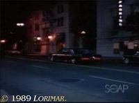The clip of Sharpe's limousine on the streets of San Francisco (first part of the drive-by) is stock footage from a film library. It features the intersection of South Grand Avenue and 6th Street in Downtown L.A. The camera's position was on the sidewalk of South Grand, first filming towards southeast, then following the limo, which drives by the Pacific Center of the Pacific Mutual Life Insurance (building at corner) and its garage ("Parking" sign); both buildings were used as filming locations before — the Pacific Center (its 6th Street front though) in # 042 and 144 (Helios Club); the garage as the New Globe parking structure in # 041. The final frame shows the western entrance of the Millennium Biltmore Hotel, which was featured in # 041 as a side entance to a New Globe annex. When the clip was filmed, South Grand Avenue was still a two-way street while it is nowadays a one-way street in the opposite direction of the limo drive-by.