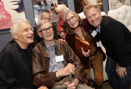 EARL HAMNER (seated) with "Falcon Crest" stars DAVID SELBY, SUSAN SULLIVAN and WILLIAM R. MOSES;