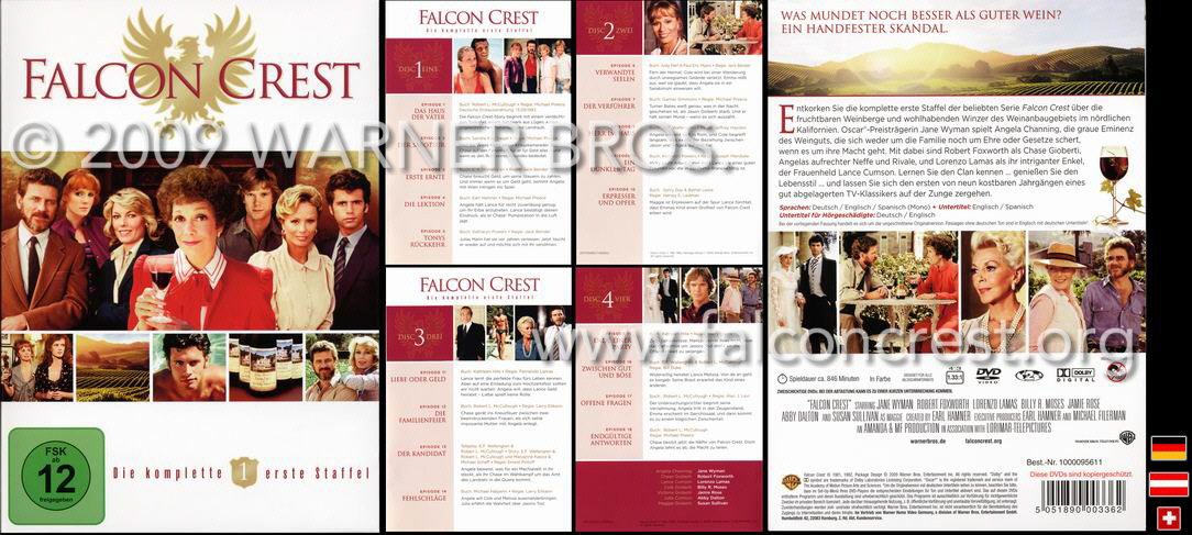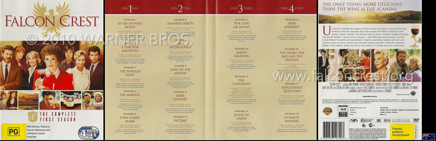 Uncork the complete first season of "Falcon Crest", the popular, long-running series centered on the rich vineyards and richer people of Northern California's wine country. Academy Award® winner JANE WYMAN stars as winery matriarch Angela Channing, who will let nothing - family, honor, the law - stand between her and power. Co-stars include ROBERT FOXWORTH as Chase Gioberti, Angela's upstanding nephew and rival, and LORENZO LAMAS as Lance Cumson, Angela's scheming, playboy grandson. Meet the characters... indulge in the lifestyle... savor the first of nine seasons of vintage television melodrama.