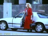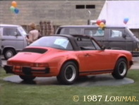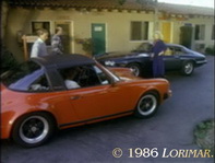 The red Porsche 911 Carrera Targa, a background car used by the couple checking in or out of Harry's Hide-away Adult Motel in # 117, later got a more prominent use on "Knots Landing" where it was purchased by Valene Ewing Gibson in "There are Smiles" (# 195 <9.05>; original U.S. airdate: 10/22/1987, CBS; screen capture 2). It was used on that show until the end of season 11.