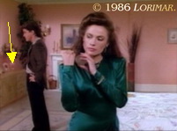 In LORIMAR's "Knots Landing", it was first used in Paige Matheson and Johnny Rourke's hotel room in Santa Tecla; the screen grab is from "Mother Knows Best" (# 214 <9.24>; original U.S. airdate: 03/31/1988, CBS).