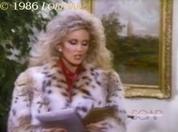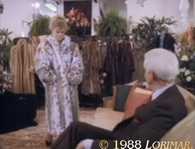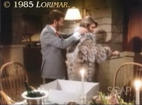The fur Chase gave Maggie for their anniversary in "Cold Comfort" (# 096 <4.28>; original U.S. airdate: 05/10/1985, CBS) on "Falcon Crest" and which was reused as the fur "Monica" wanted to buy in "Law and Ardor" (# 119 <5.21>; original U.S. airdate: 02/28/1986, CBS) — upper row of screen captures — ended up on "Dallas": first, in "Malice in Dallas" (# 272 <9.21 – original count> / <10.21 – DVD count>; original U.S. airdate: 02/26/1988, CBS) where SHEREE J. WILSON's character April Stevens tried it on in a clothes store (screen capture 3); later in "Paradise Lost" (# 327 <12.20 – original count> / <13.20 – DVD count>; original U.S. airdate: 03/09/1990, CBS) in another fur store (on the left on the clothes rail in the background; screen grab 4).