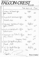 Each script has an individual list of sets that are needed for the episode. This is the basic information for the location manager and the set designers, especially when new locations or sets are introduced. It is also important for editors as they sometimes have to look for stock footage from previous episodes or even archived footage from other LORIMAR shows that could be reused — for an establishing clip, for example — in order to save production cost.